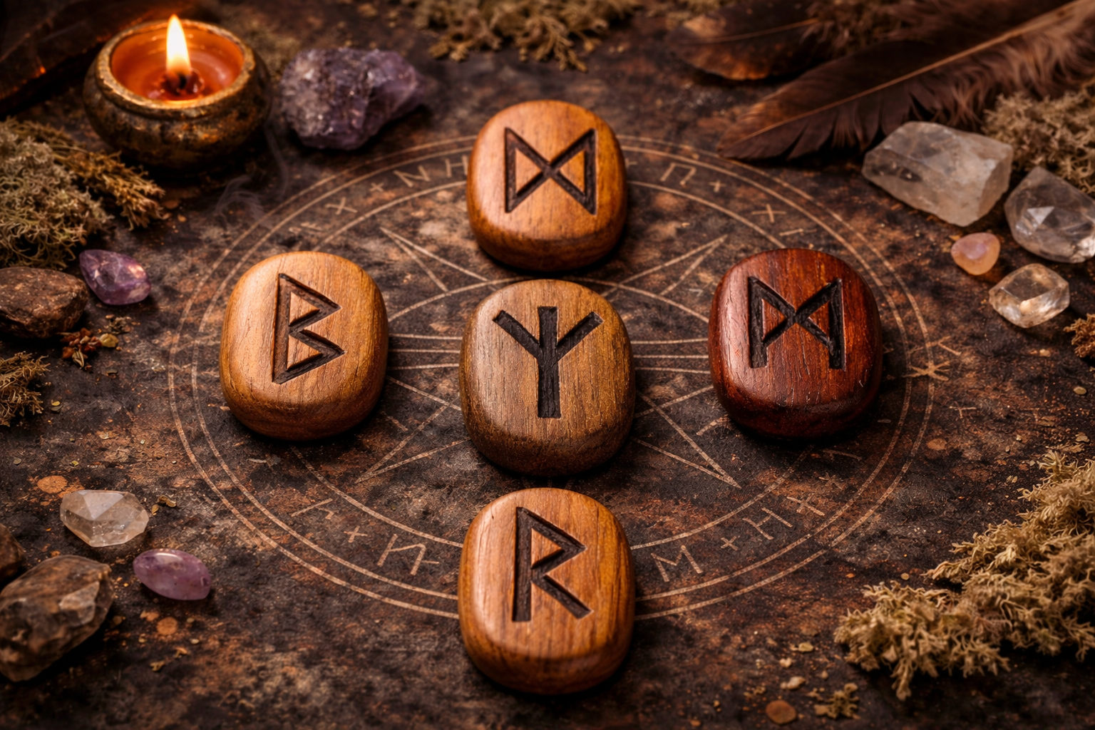 Le tirage à cinq runes, appelé le Marteau de Thor, s’inspire de la symbolique de Thor, dieu du tonnerre et fils d’Odin, figure de puissance, de protection et de rééquilibrage.